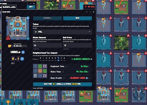 Ponziland is a map of tiles. Some produce yield. You rent land around them. Your land earns fees from nearby activity. As demand rises, rent rises. Stop paying rent, and your land gets auctioned. And then there’s the Nuke. It goes up for auction at a set cadence. Buy it, and you can instantly liquidate someone else’s land.