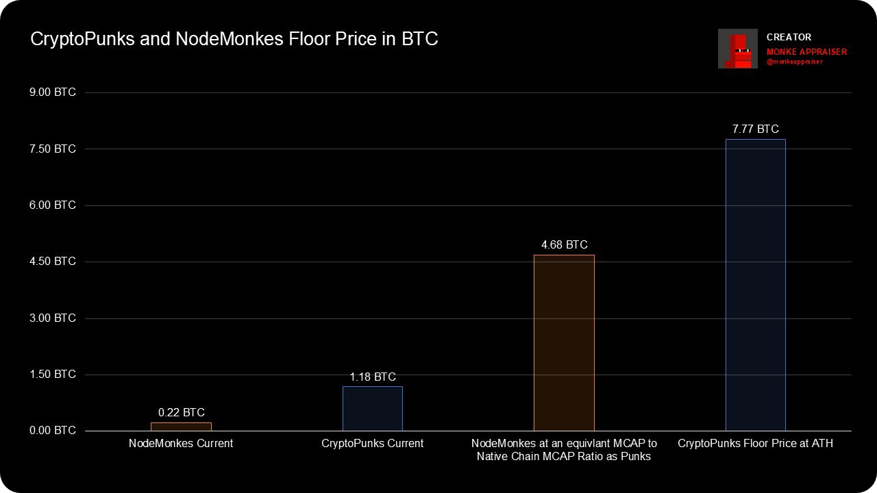 The conclusion? While CryptoPunks' market cap is 0.2% of Ethereum's market cap, NodeMonkes' market cap is only 0.01% of Bitcoin's. If NodeMonkes were to reach a similar ratio, the floor price would be around 4.68 BTC—approximately 21 times the current floor price.