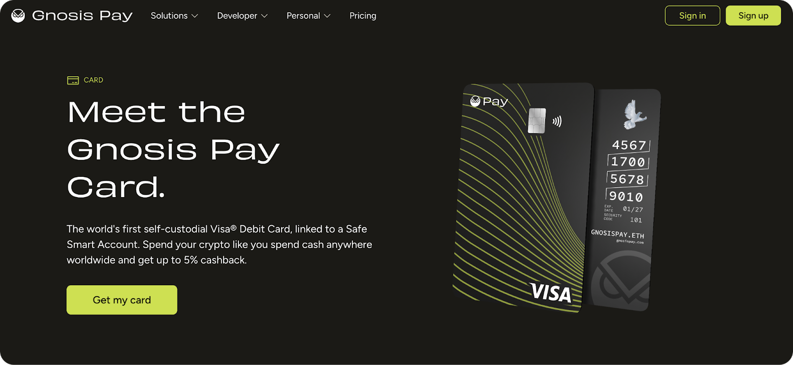 Gnosis Pay uses Safe smart accounts for self-custody, allowing you to create virtual or physical Visa cards quickly with programmable spending limits. It supports multiple chains like Ethereum and Polygon and integrates with Apple Pay. Yields come from DeFi integrations like sDAI on stablecoins, typically 4-6% APY depending on market conditions. FX conversions use DeFi rates with no fees, particularly attractive for EU residents who travel frequently in and out of the Eurozone. (This is all powered by Monerium, which I touched on earlier.) Cashback ranges from 1-5%, though it's paid out weekly in GNO tokens based on your holdings.