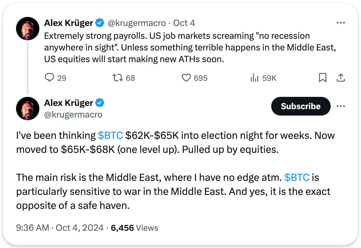 Bitcoin dropped from $66K to $59K this week to kick off “Uptober.” The move was driven by nerves around economic data and escalating geopolitical tensions in the Middle East between Iran and Israel. However, by Friday, BTC had stabilized and risen to ~$62K after the U.S. reported a blowout 254K jobs added in September. This surge in employment eased market fears of a recession, though with the election looming and Israel’s response to Iran still undetermined, uncertainty still swirls in the market.