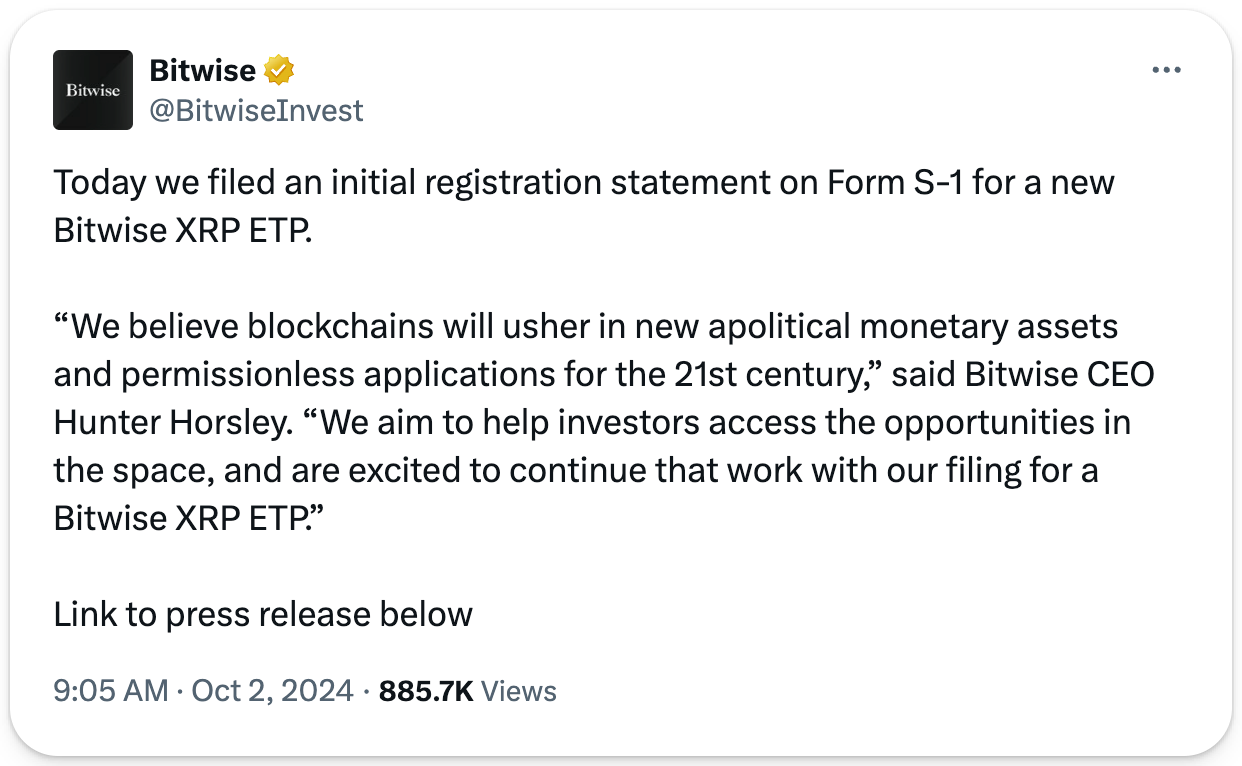 It was off to the races for the spot CRP ETF earlier this week, with Bitwise’s filing this week and Canary Capital’s filing rumored to soon follow. However, the SEC derailed matters by filing an appeal in the Ripple case, challenging the July ruling that XRP isn’t inherently a security. The appeal sets the stage for a high-stakes legal battle that could, at best, greatly slow down the approval process or, at worst, halt it in its tracks or liquidate it even after it gets approved (if it does).