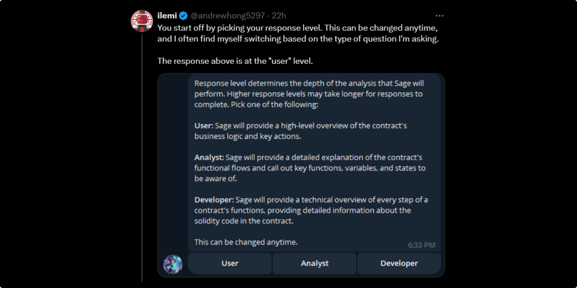 Here, cue in Sage, a new LLM-powered bot created by ilemi that can help you answer questions about smart contracts at a “User,” “Analyst,” or “Developer” level depending on your experience.