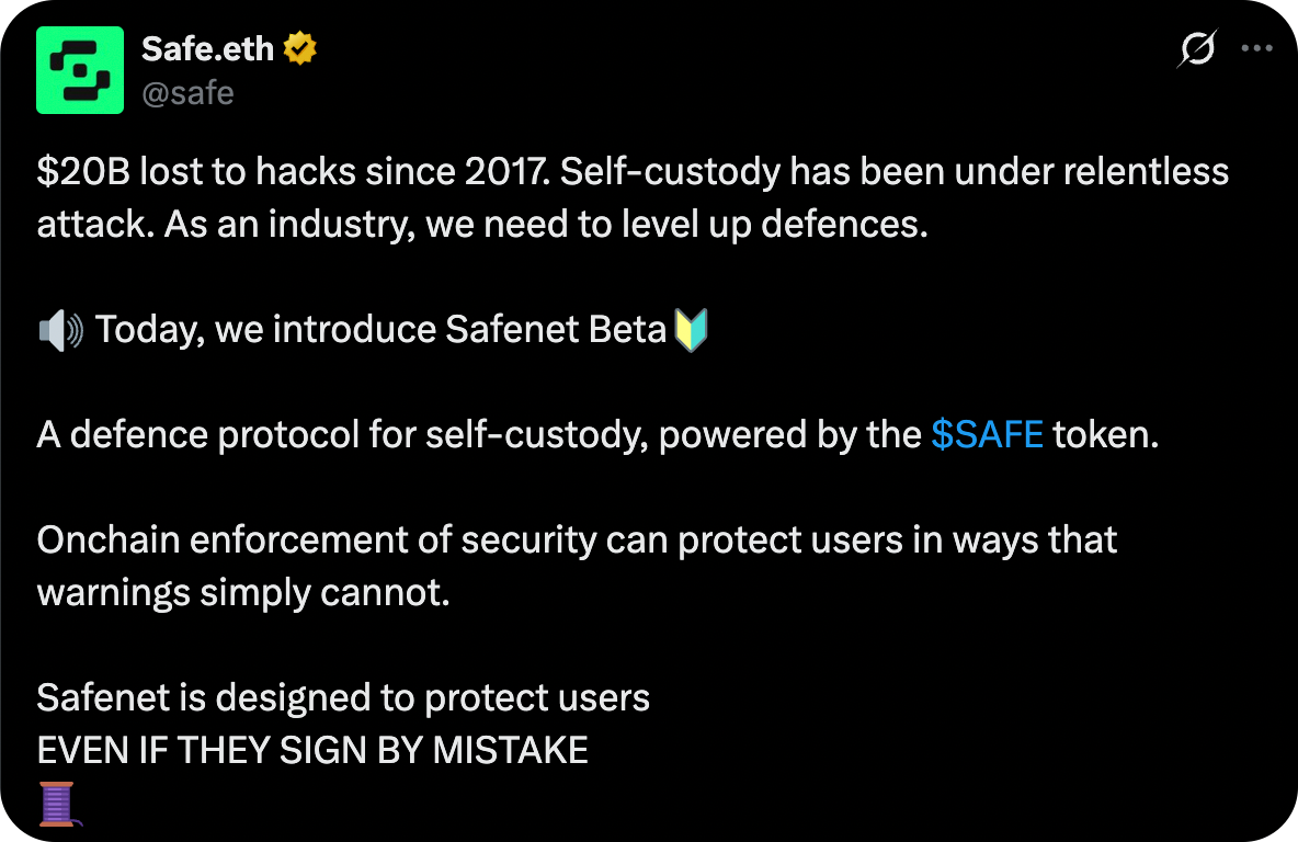 But Safenet addresses something the rest of the stack can't compensate for: the integrity of the transaction itself. Every other security measure, audits, simulations, multisig ceremonies, depends on the assumption that what a signer sees is what they're signing. Safenet moves that check out of the interface and into the execution path, where a decentralized validator network enforces it before a single dollar moves.