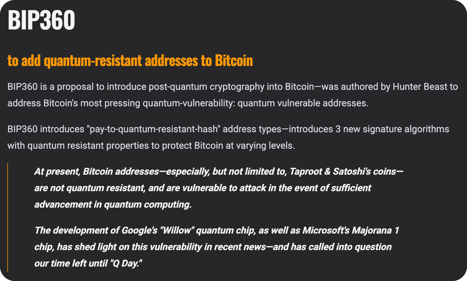 The Bitcoin community has been developing standards through Bitcoin Improvement Proposals (BIPs). Last year, a notable proposal called BIP 360, authored by pseudonymous Bitcoin developer, Hunter Beast, outlined a phased strategy to retire vulnerable legacy signature schemes by 2030, introducing quantum-resistant addresses under the proposed "Pay-to-Quantum-Resistant-Hash" (P2QRH) format, in a manner that would allow “developers, wallets, and users to opt into post-quantum security without forcing the entire network to switch at once," explained Tomas.