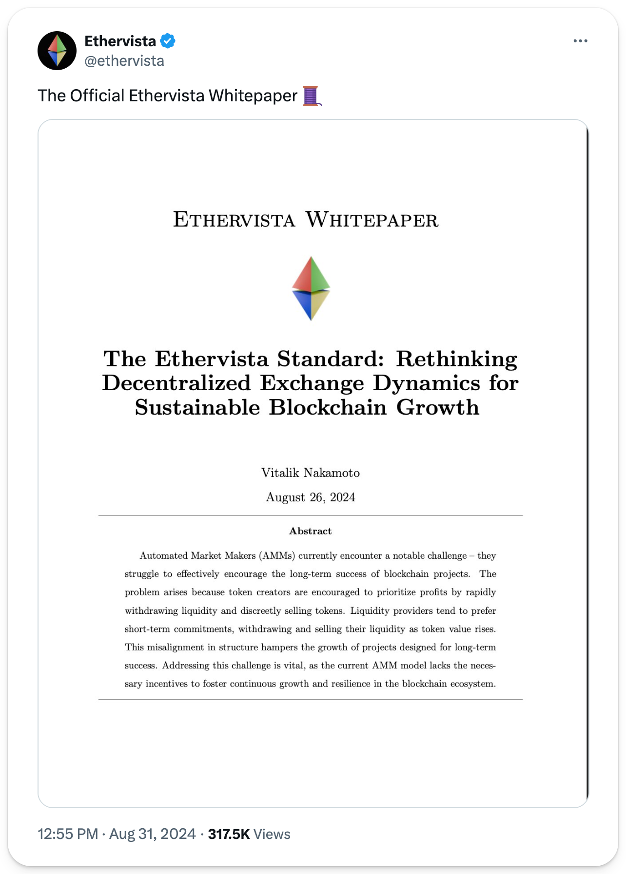 Ethervista, the newly launched DEX and token launcher for Ethereum and Layer 2s, has made waves this week, with its VISTA token up over 20x. The no-code token launchpad and creator fee system aims to prevent quick rug pulls, a common risk in meme coin markets, and has seen ~$355K in volume traded since its launch on Aug. 31st. The DEX’s design has sparked excitement, with VISTA being fair launched to LPs on the platform, tokens needing to lock liquidity for 5 days — as rugs typically happen in 2-4 days, Ethervista’s research claims — and fees for swapped tokens being priced in ETH and distributed to both liquidity providers and token creators.