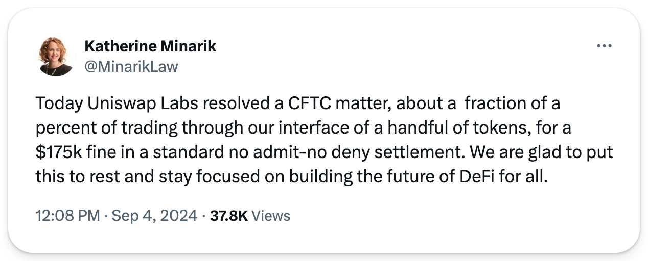 Uniswap Labs announced a settlement with the CFTC this week, paying $175K for enabling leveraged token derivatives to be traded on the exchange, violating commodity laws. Meanwhile, a16z and Union Square Ventures, key investors in Uniswap, received subpoenas from the NY Attorney General, adding to the legal pressure Uniswap faces after the SEC’s Wells Notice from April. We can expect more developments following the DeFi hearing on September 10.