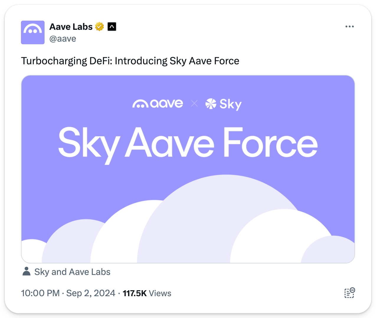 Aave and Sky (formerly MakerDAO) have teamed up to launch Sky Aave Force, aiming to integrate Sky's rebranded stablecoins USDS and sUSDS into Aave V3. If the proposal is passed, the initiative will feature a 3.33M SPK monthly airdrop for sUSDS suppliers and a 100M debt ceiling for USDS in Aave’s Lido market. This partnership also promises a 50/50 revenue split and aims to boost both the expansion of Sky’s new tokens and Aave’s native stablecoin GHO.