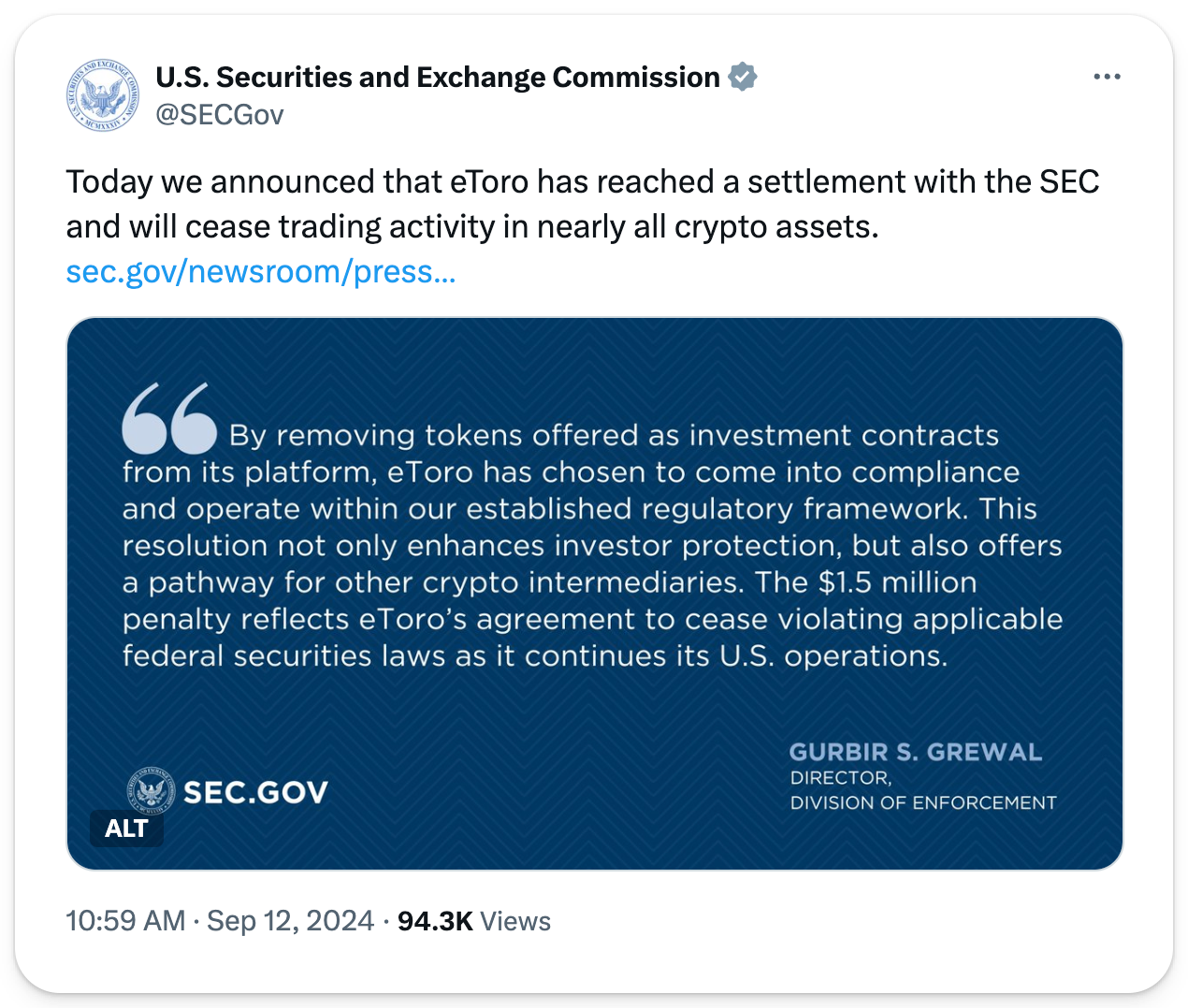 On Thursday, eToro agreed to a $1.5M settlement with the SEC over allegations that it operated as an unregistered broker and clearing agency by offering certain crypto assets as securities. As part of the settlement, eToro will limit its crypto offerings for U.S. users to just Bitcoin, Bitcoin Cash, and Ether, with all other crypto assets to be sold off within 180 days. While eToro has avoided a prolonged legal battle, U.S. users have more limited options on where to buy tokens, which adds to confusion around how regulators view these assets moving forward.