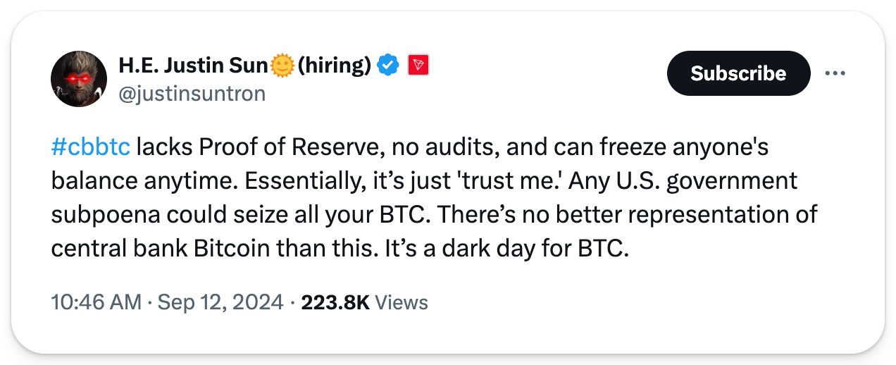 On Thursday, Coinbase launched cbBTC on Ethereum and Base, allowing users to hold wrapped Bitcoin backed 1:1 by the exchange’s Bitcoin reserves. This move allows owners to use Bitcoin in DeFi protocols, with exchanges like Aerodrome and Curve already supporting cbBTC. Predictably, Justin Sun, who holds majority control in WBTC's custodian BitGo, criticized the product, claiming it lacks proof of reserves and auditing mechanisms. Sun pointed out that cbBTC can be frozen anytime and questioned its centralization, calling it “central bank Bitcoin.”
