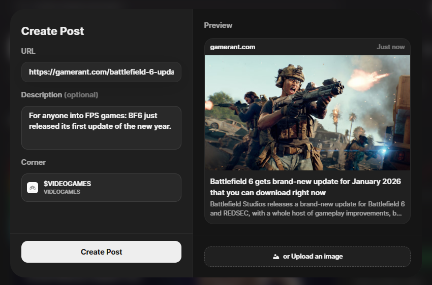 - Through your coin holdings, you can also start curating posts for your target corner. Just press the "Create new post" button in your corner of choice. Doing so will bring up a simple UI where you can submit a relevant link + description. Here's an example post I made.