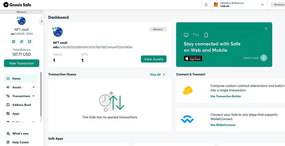 Back in the main Gnosis Safe dashboard, you’ll be able to see your new NFT vault and its address.