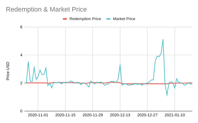 RAI employs principles from control theory in order to stabilize itself. Its “moving peg” (or as I call it, the redemption price) can start at an arbitrary price (such as pi) and then the “peg” changes according to what RAI’s market price is on exchanges. The simplest, although not fully accurate way to describe RAI’s mechanism is as follows: if the market price of RAI is above the redemption price, the protocol will determine how fast the redemption price will start to go down.