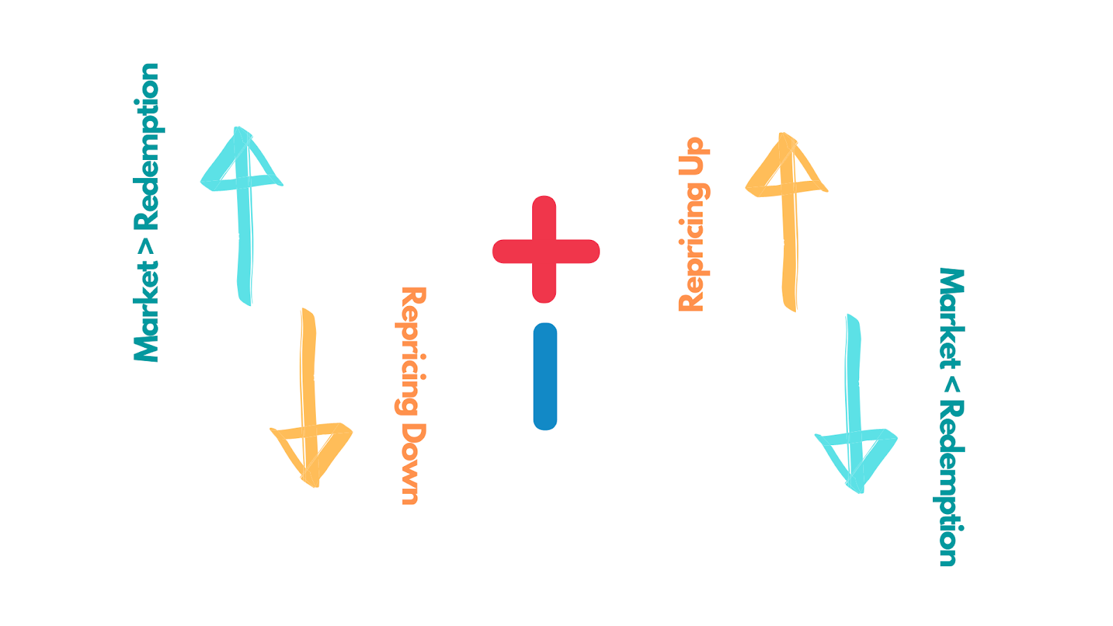 In the other scenario where the redemption price is going down, someone who’s watching the protocol can start to short (or sell) RAI. Selling will make the market price go down and this way it will follow the redemption price which has already depreciated. This results in a net loss for RAI holders and a gain for people who minted RAI because they can now buy RAI from the market at a cheaper price than before and close their positions.