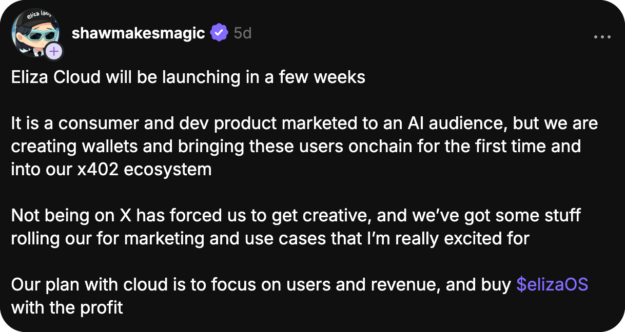 From what's been shared on socials, the next big release for Eliza seems to be Eliza Cloud, which will be a "consumer and dev product marketed to an AI audience," intended to bring users onchain through the use of x402 and wallets on the backend. Shaw has stated the goal here is to grow revenue for the project, which will be used to buyback and burn $ELIZAOS.