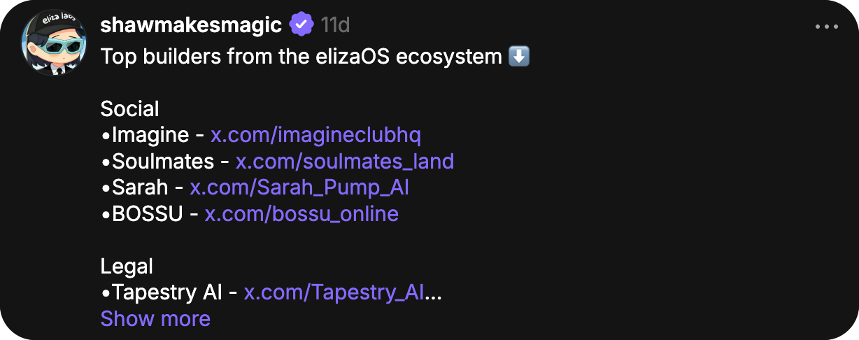 If you're interested in playing around with some of the agents in the ecosystem, Shaw recently spotlighted the "top builders in the ecosystems." Since it's a rather long list, I pulled together the ones which stood out most to me below:
