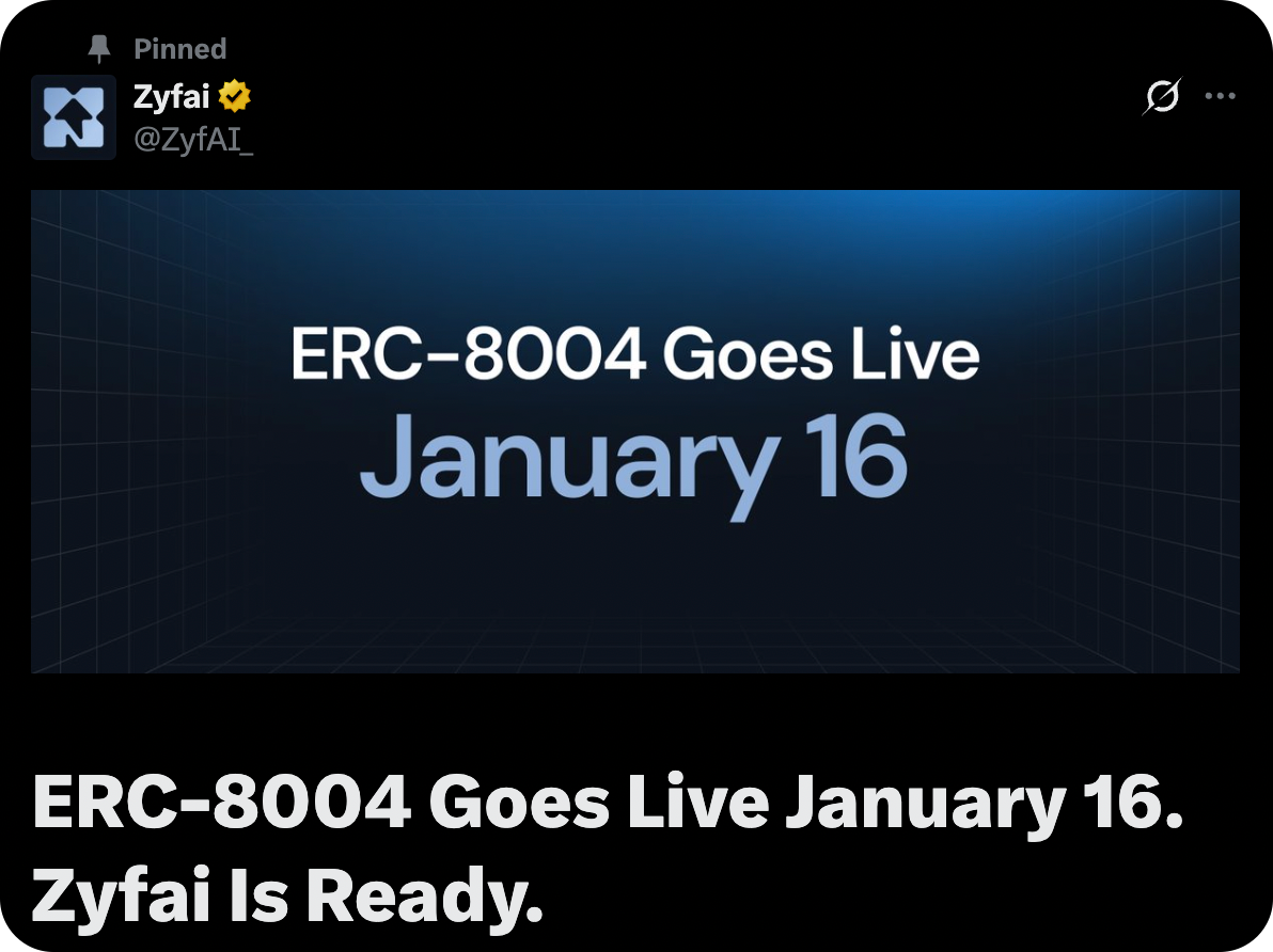This piece may fall into place next Friday, January 16. Zyfai, a leading yield agent building with ERC-8004, claims that the standard will launch then, bringing onchain identity and reputation infrastructure to equip agents with the trust marketplaces need to succeed. If x402 handles how agents pay, ERC-8004 handles whether they should.