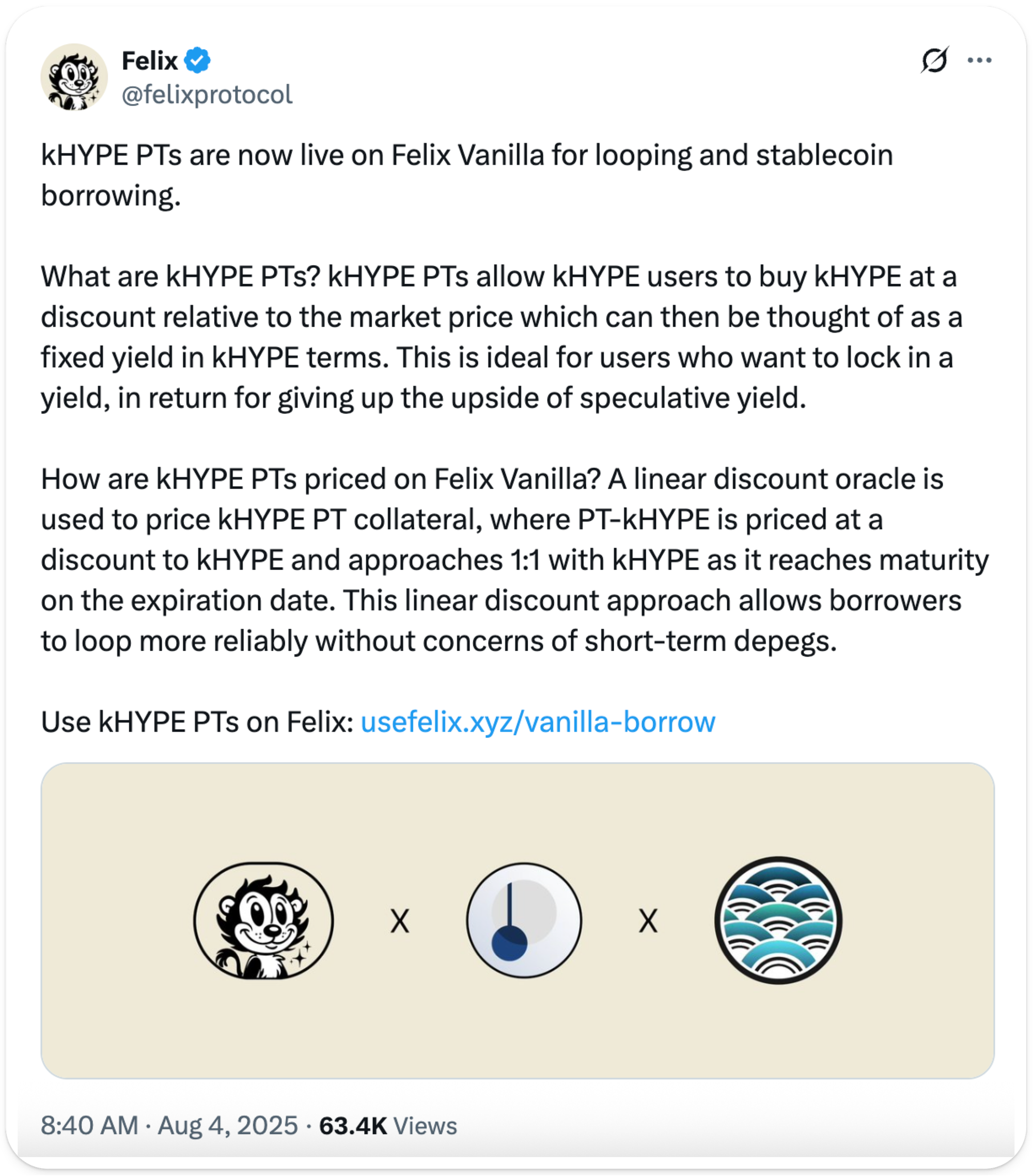 Also, while Felix uses a special oracle to monitor PT-kHYPE prices for safer looping, higher LTV still means higher risk. I'd recommend substantial breathing room — maximum 60-70% LTV. (h/t to Charlie and DeFi Dad for outlining this play.)