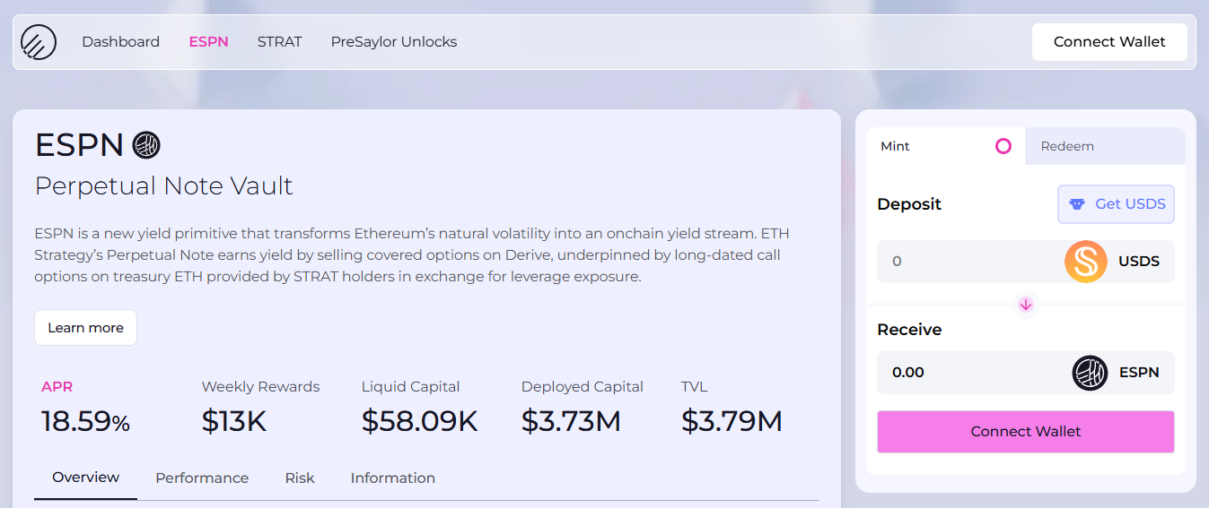 ESPN, short for ETH Strategy Perpetual Note, is a yield-generating vault that sits within the ETH Strategy ecosystem.