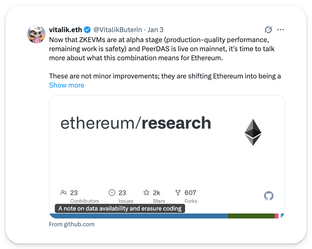 Blockchains have long been perceived as doomed to accept a suboptimal balance between decentralization, security, and scalability (the blockchain trilemma). Buterin believes that zkEVMs and PeerDAS can help Ethereum scale without tradeoffs, producing a “fundamentally new and more powerful kind of decentralized network.”