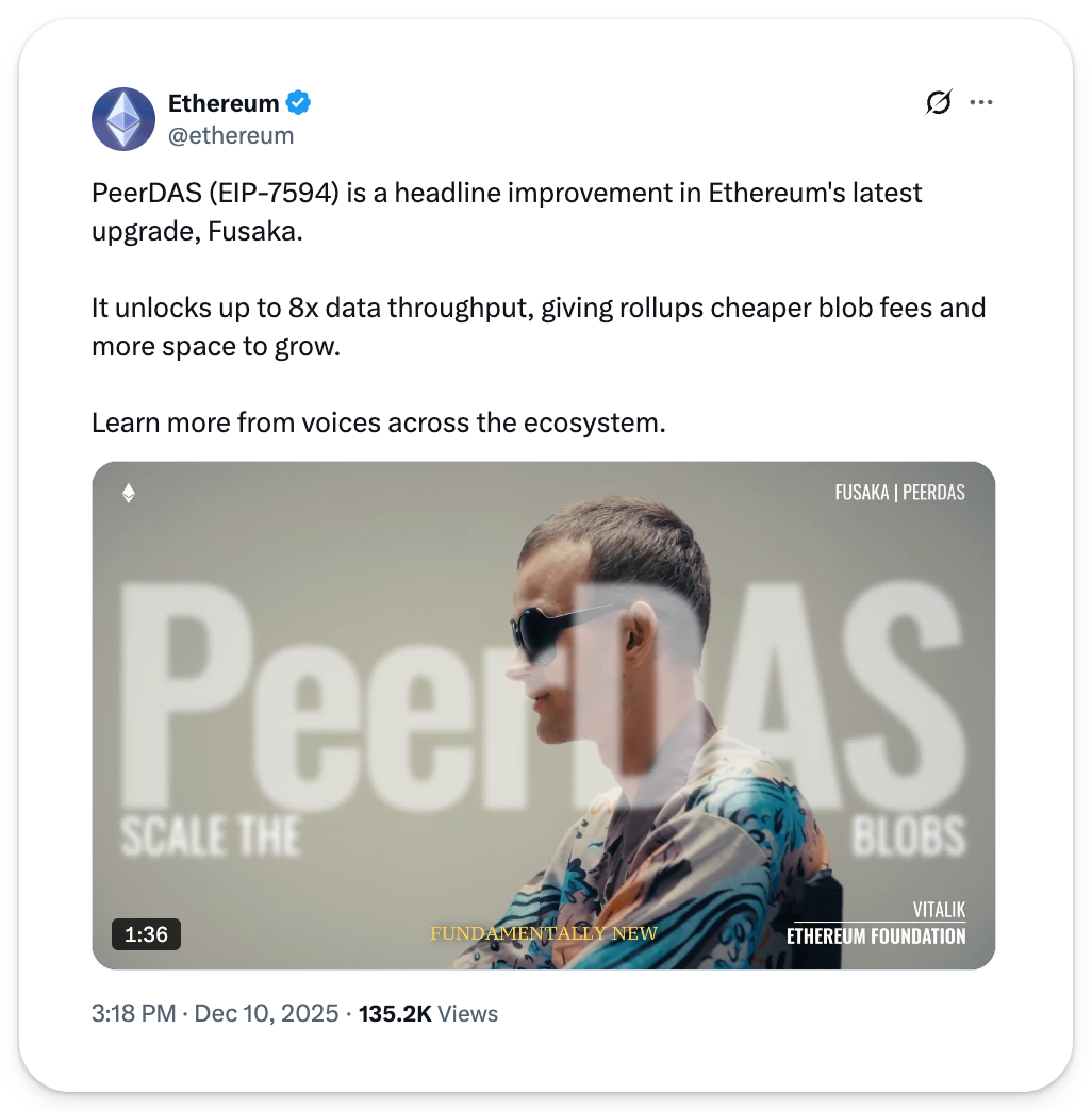 Peer-to-Peer Data Availability Sampling (PeerDAS) is Ethereum’s latest leap in data scaling. It was adopted on mainnet on December 3, 2025, and served as the headline improvement of Ethereum’s recent Fusaka upgrade.