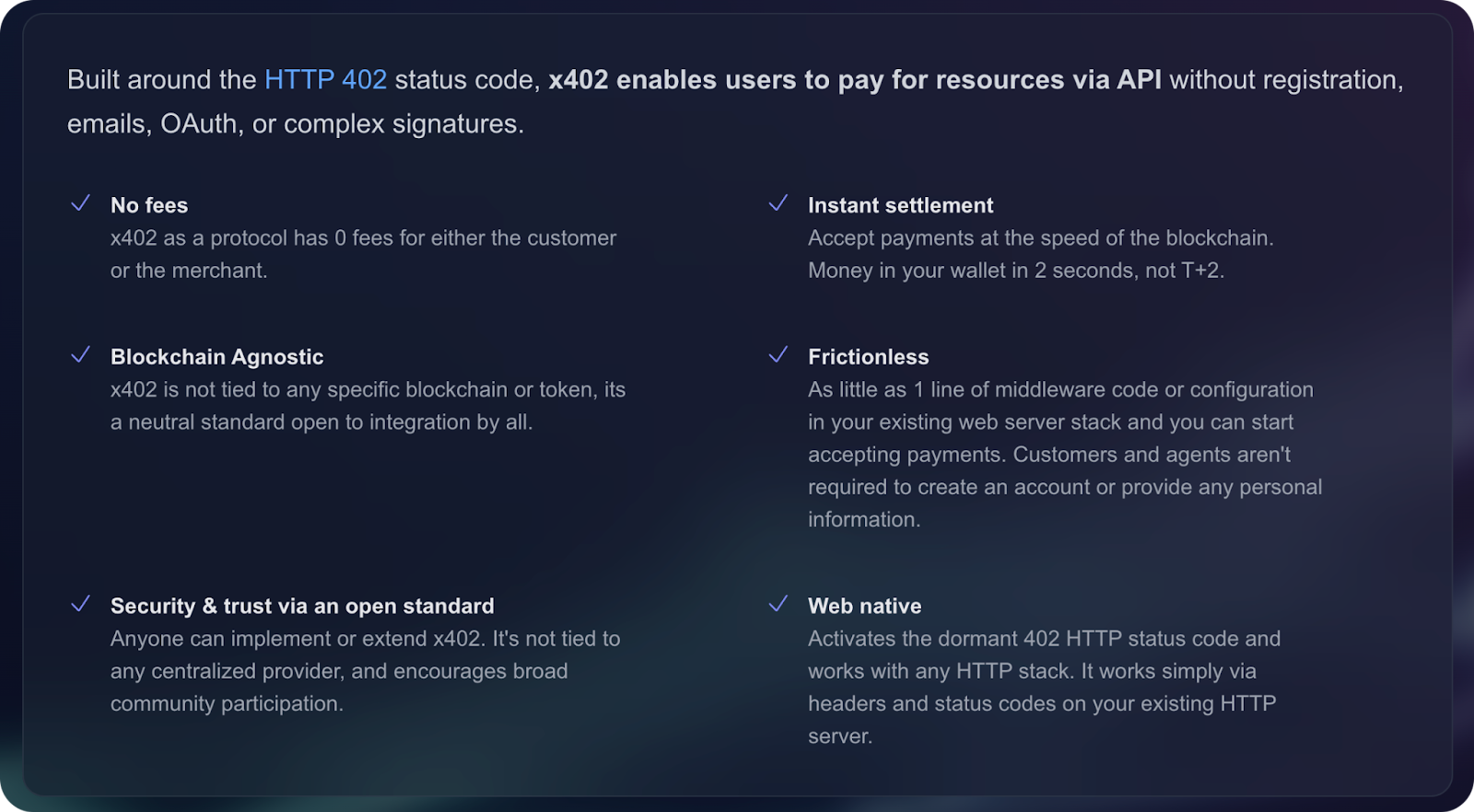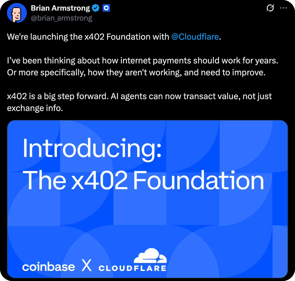 - x402 provides the payment plumbing, embedded directly into web requests and routed through Cloudflare's network (which handles a massive chunk of global internet traffic).
