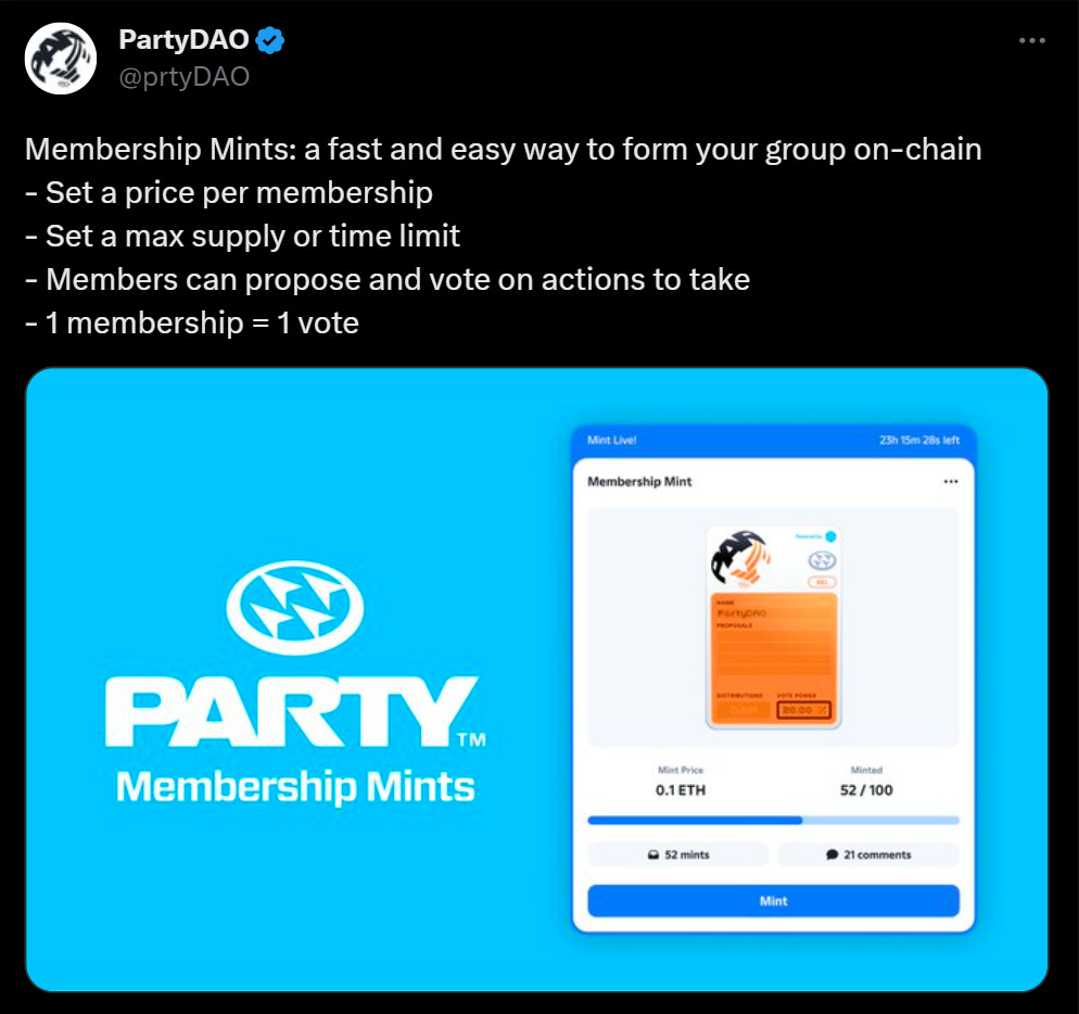 Yet there’s a new way to group up as of this week, as PartyDAO just rolled out Membership Mints, which, like the name suggests, lets people run customizable mints for Party Cards. Set a mint price, plus a max supply or time limit, and then people can jump in as they please, with each mint counting for one vote in the ensuing Party.