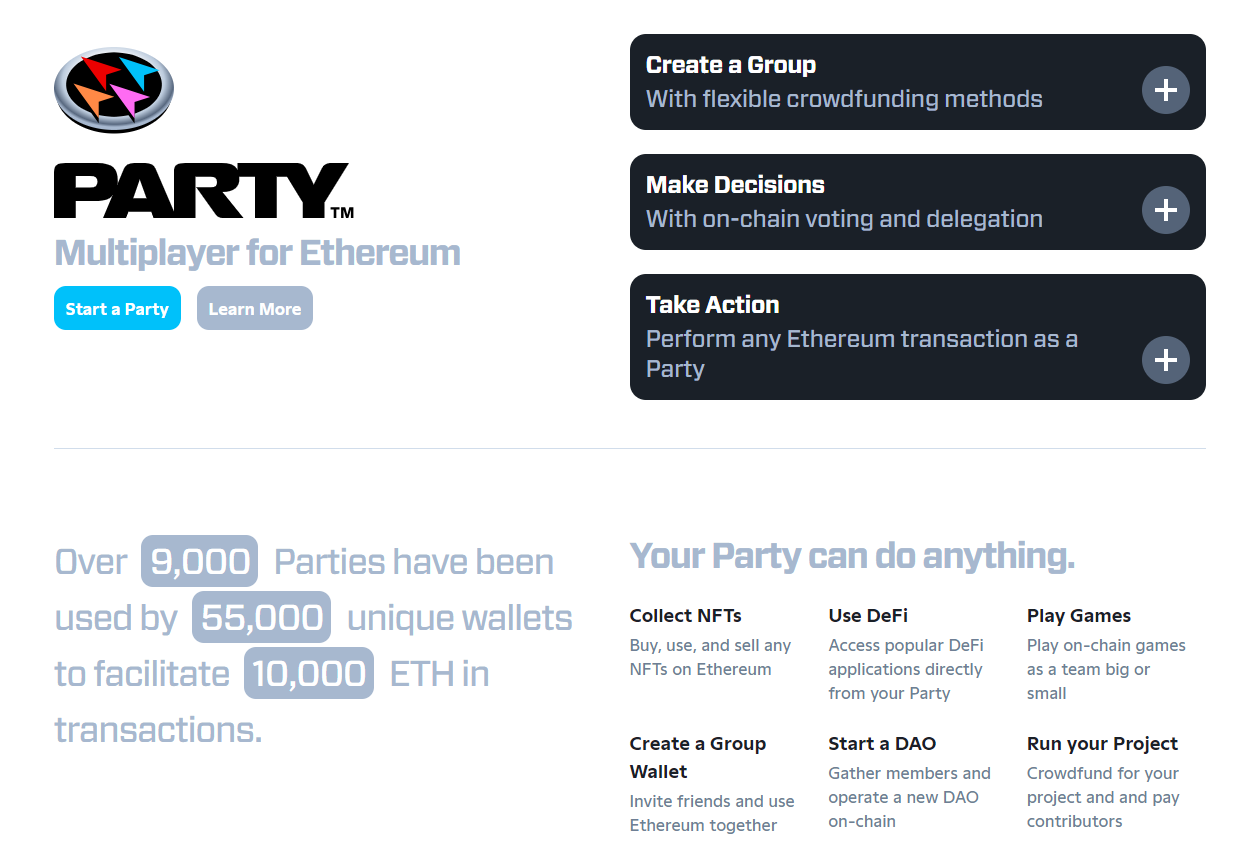 Fast forward to this month, June 2023, and PartyDAO just rebranded PartyBid to Party and doubled down on expanding the app’s scope. Beyond its origins in facilitating NFT collector groups, Party now lets its Parties undertake any actions they want together on Ethereum, from using DeFi to playing NFT games and anything in between.