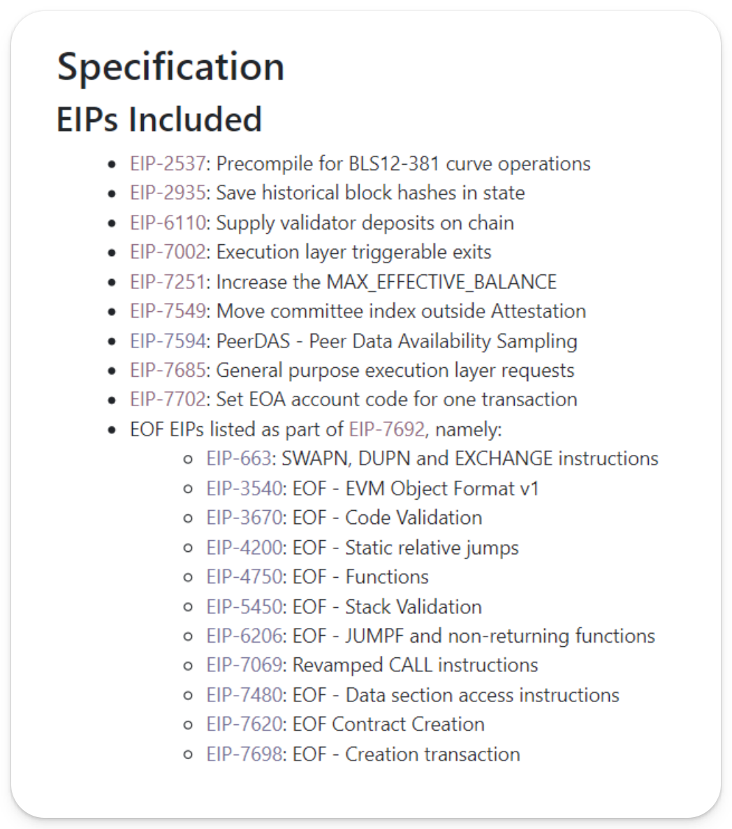 These EIPs include enhancements around account abstraction, validator operations, and overall network performance. Some of the most notable additions are as follows.