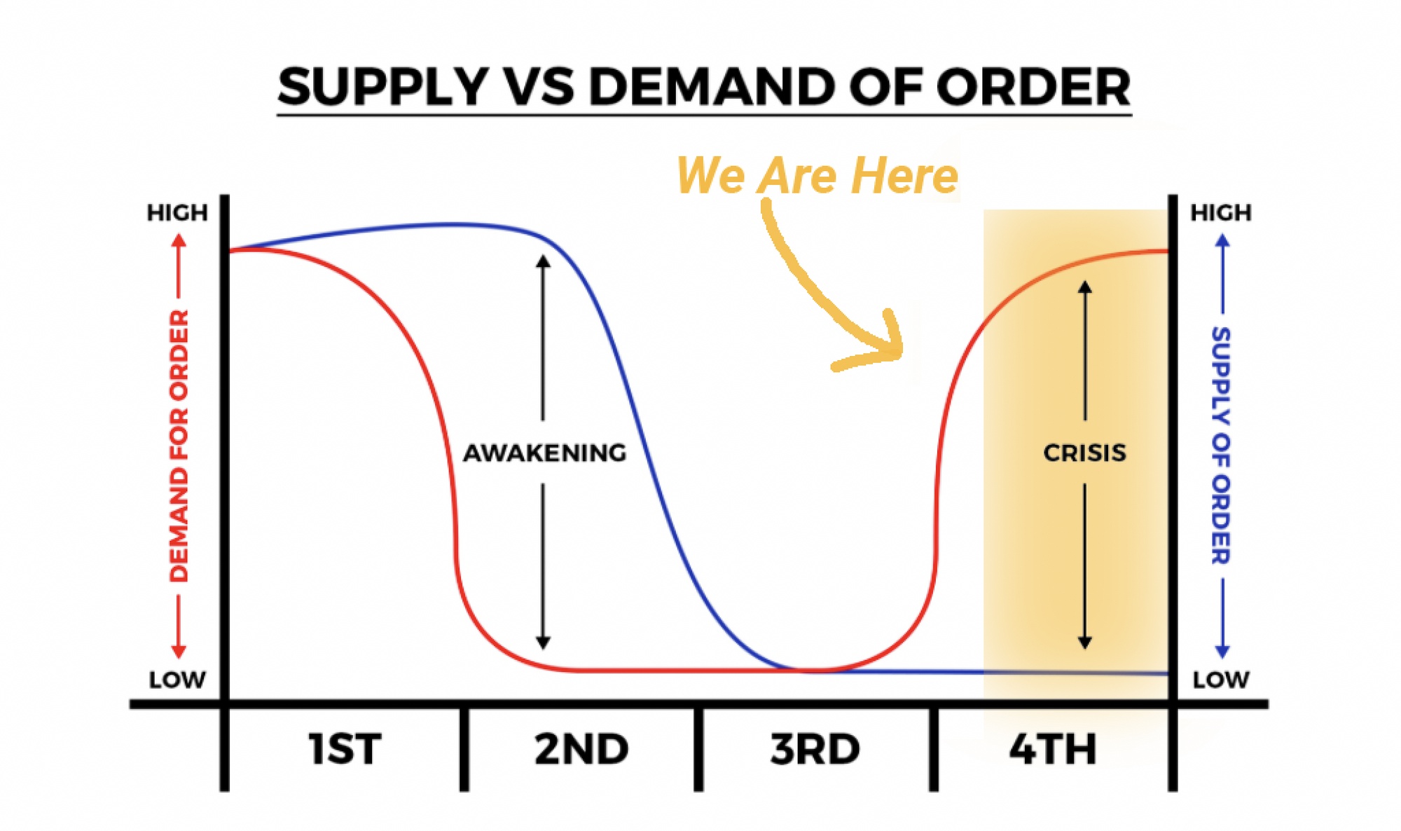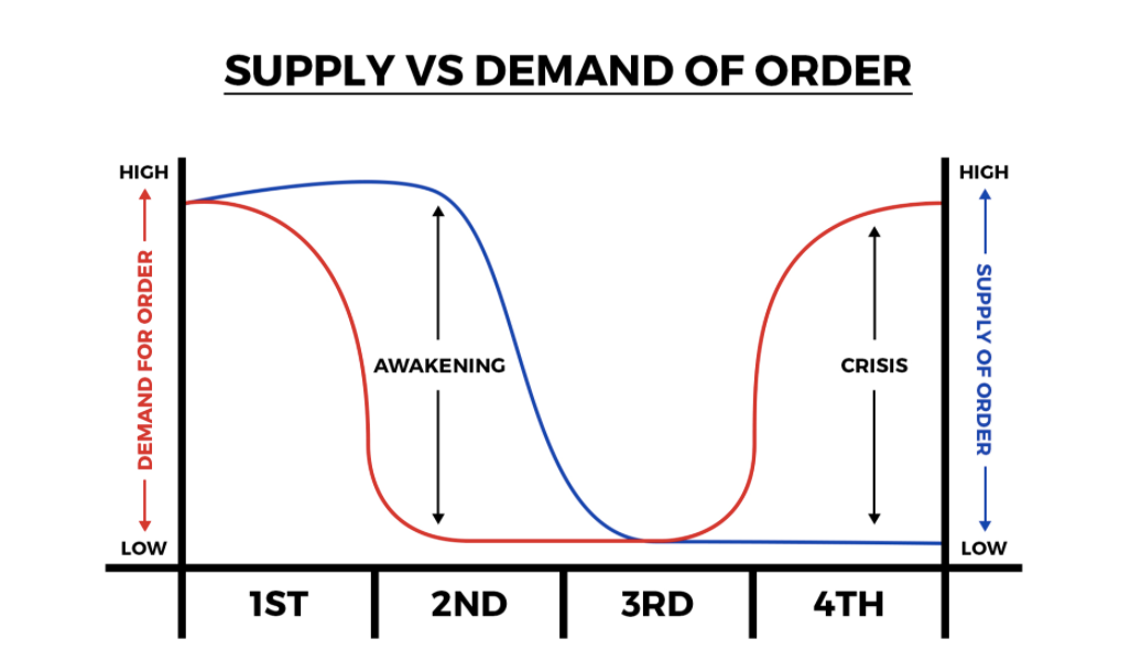 According to the Fourth Turning thesis, we are currently in a time in which there is low supply of order, with growing demand for order.