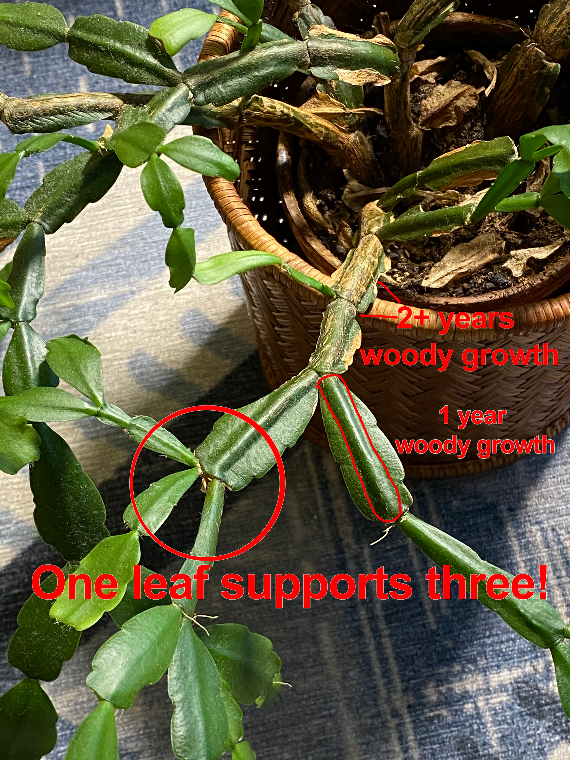 Meanwhile, in order to support and sustain any new successful ventures, all the old leaves on the Christmas Cactus become woody. The internal structure of older leaves begins to harden. They morph from being floppy, soft, and delicate into woody, firm, and durable. These older leaves form a solid stick-like structure on their inside, which helps generate a stable and dependable branch for new growth to build from. Next growing cycle, some fresh new baby leaves are sure to grow out of these veteran leaves.