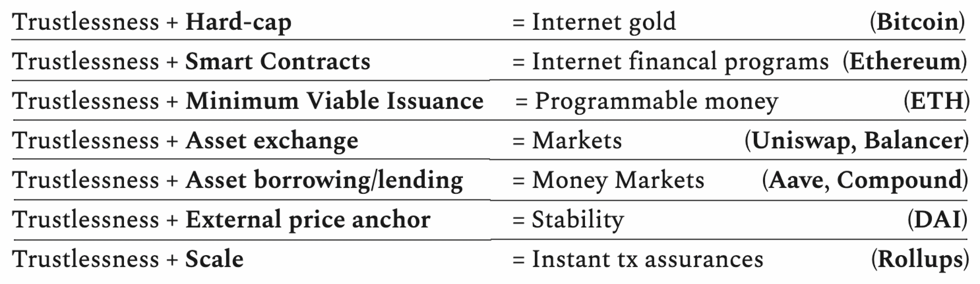When an application like Uniswap is added into the structure, it imbues the rest of the struture with their trustlessness. When applications like Uniswap exist, it helps other applications grow their own trustlessness, because they can simply plug into Uniswap if they need an exchange feature.