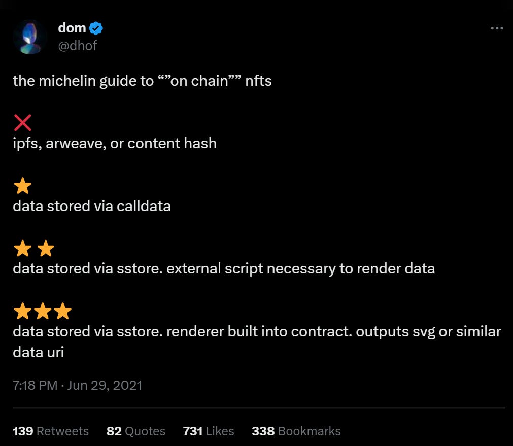 For these sorts of limitations, dom — the creator of Blitmap and Sup — aptly granted calldata-based projects a one-star rating in his now cult classic “Michelin Guide to Onchain NFTs.” So Ethscriptions = ⭐️ in this ranking system, not horrible but not great, right.