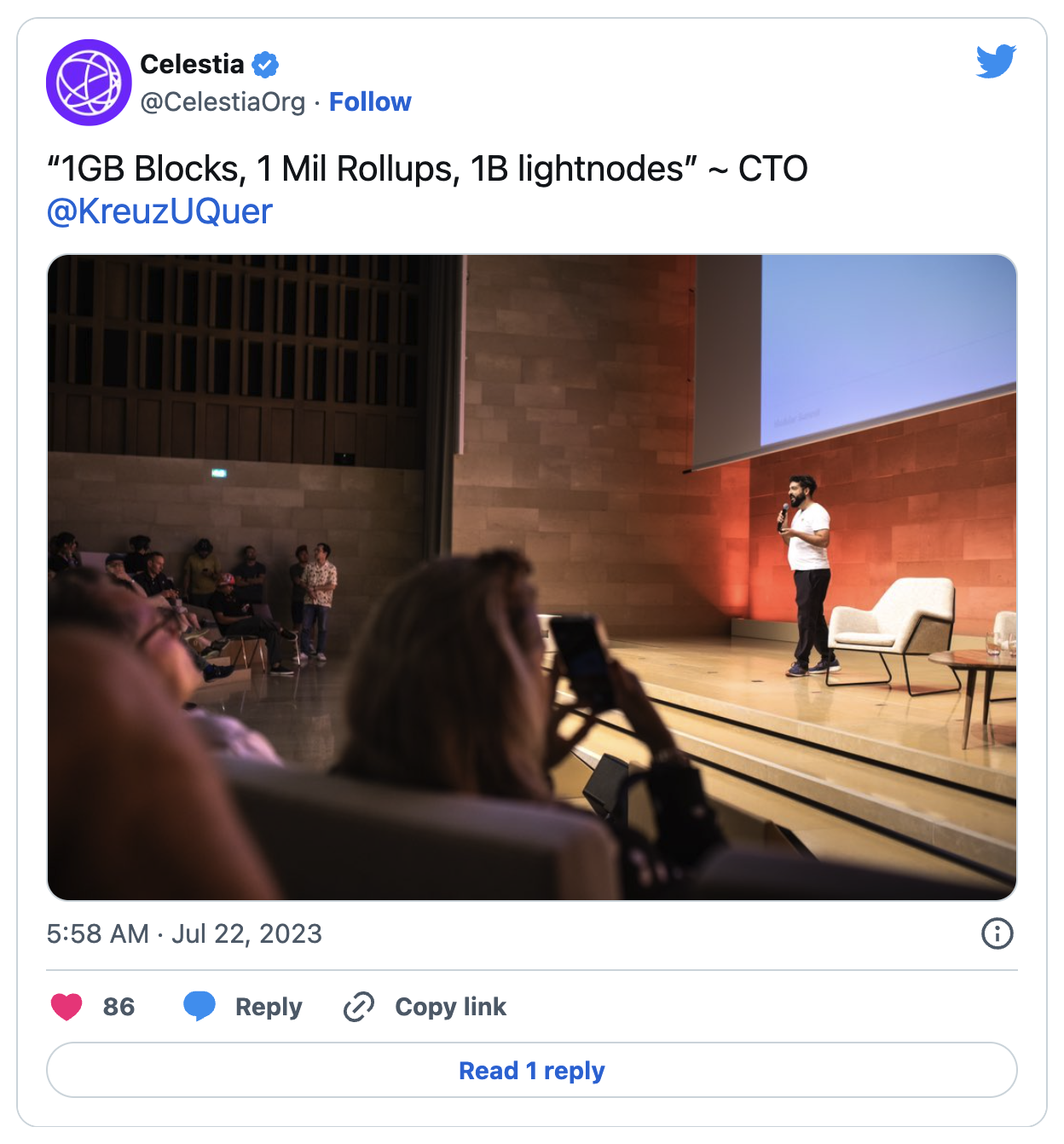 It doesn’t stop at data availability. Espresso Systems had a glowing reception at the largest EthCC side-event, the Modular Summit. With their shared sequencer testnent and Eigenlayer partnership, Espresso isn’t waiting for L2s to each build their own shared-sequencer system, instead focusing on one thing and one thing only: optimizing shared sequencing.