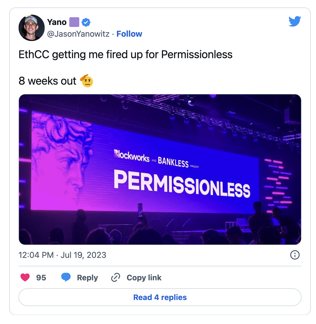 The next Bankless meetup at Permissionless is going to be our largest yet! Permissionless is the home of IRL Bankless, since it's the only conference that Ryan actually goes to and the spiritual anniversary of when we actually met for the first time.