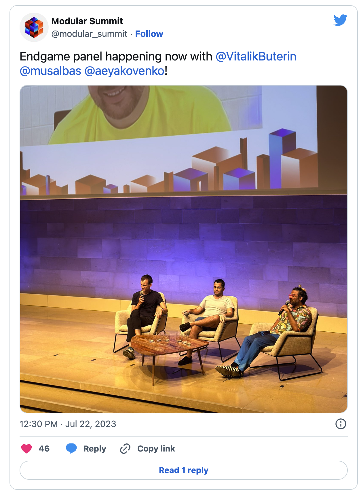 It’s funny to see the different archtypes that find the modular community home and resonate with it more than the 100% purely Ethereum crowd. It’s also interesting to see these communities naturally come together, as the technology form factors pair so well. Ultimately, Ethereum will come to absorb all the useful modules that the modular community will produce – 'tis the nature of the system to aggregate all useful open-source code into one single superstructure.