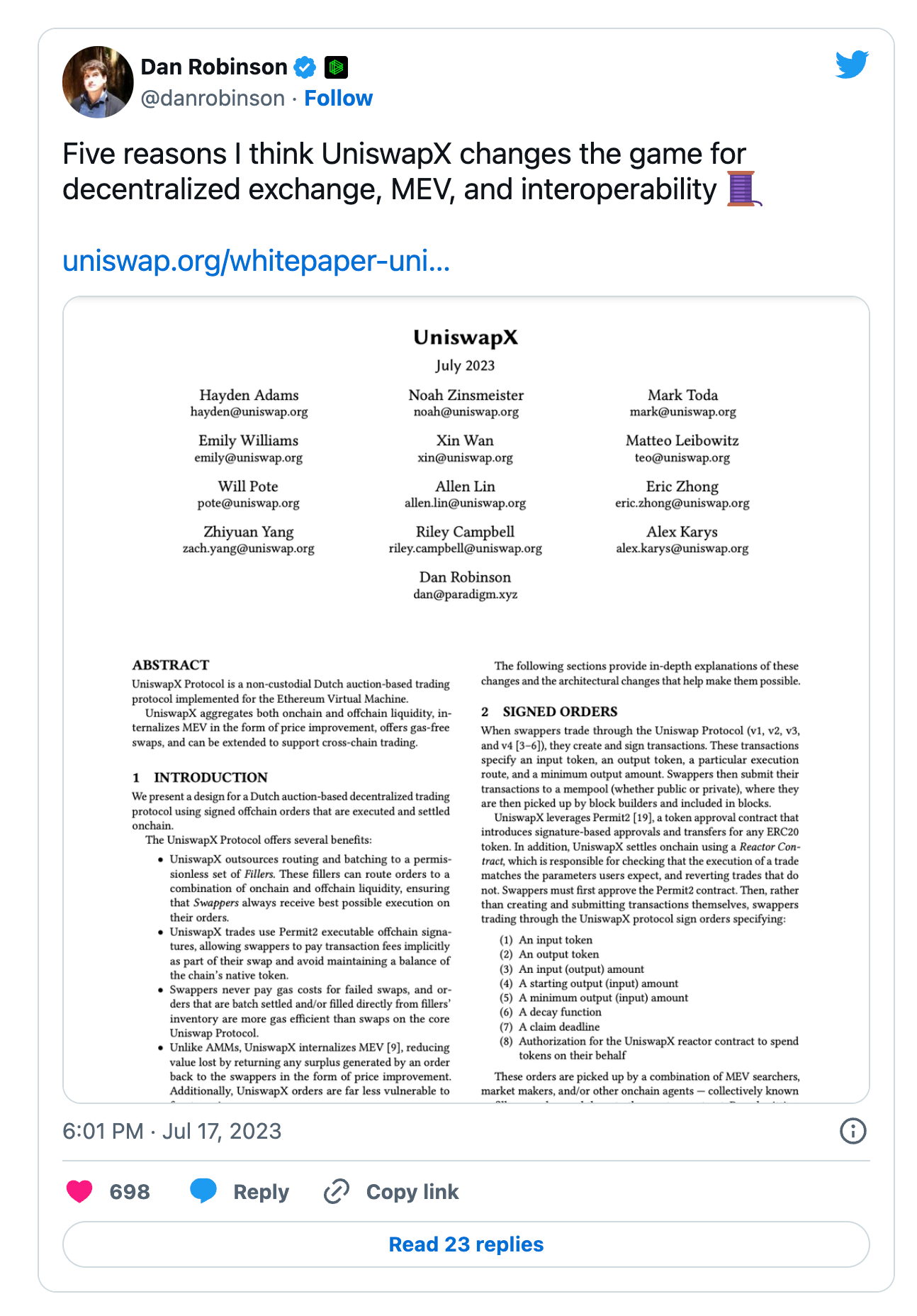 Here’s a useful thread from Dan Robinson on the UniswapX design – or just wait for the podcast we’re recording soon!