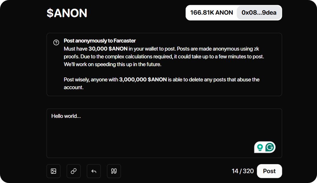 The big idea? Anyone holding 30,000 $ANON can use the new platform to post anonymously to Farcaster, where the casts are surfaced across popular ecosystem apps like Warpcast, Supercast, etc.