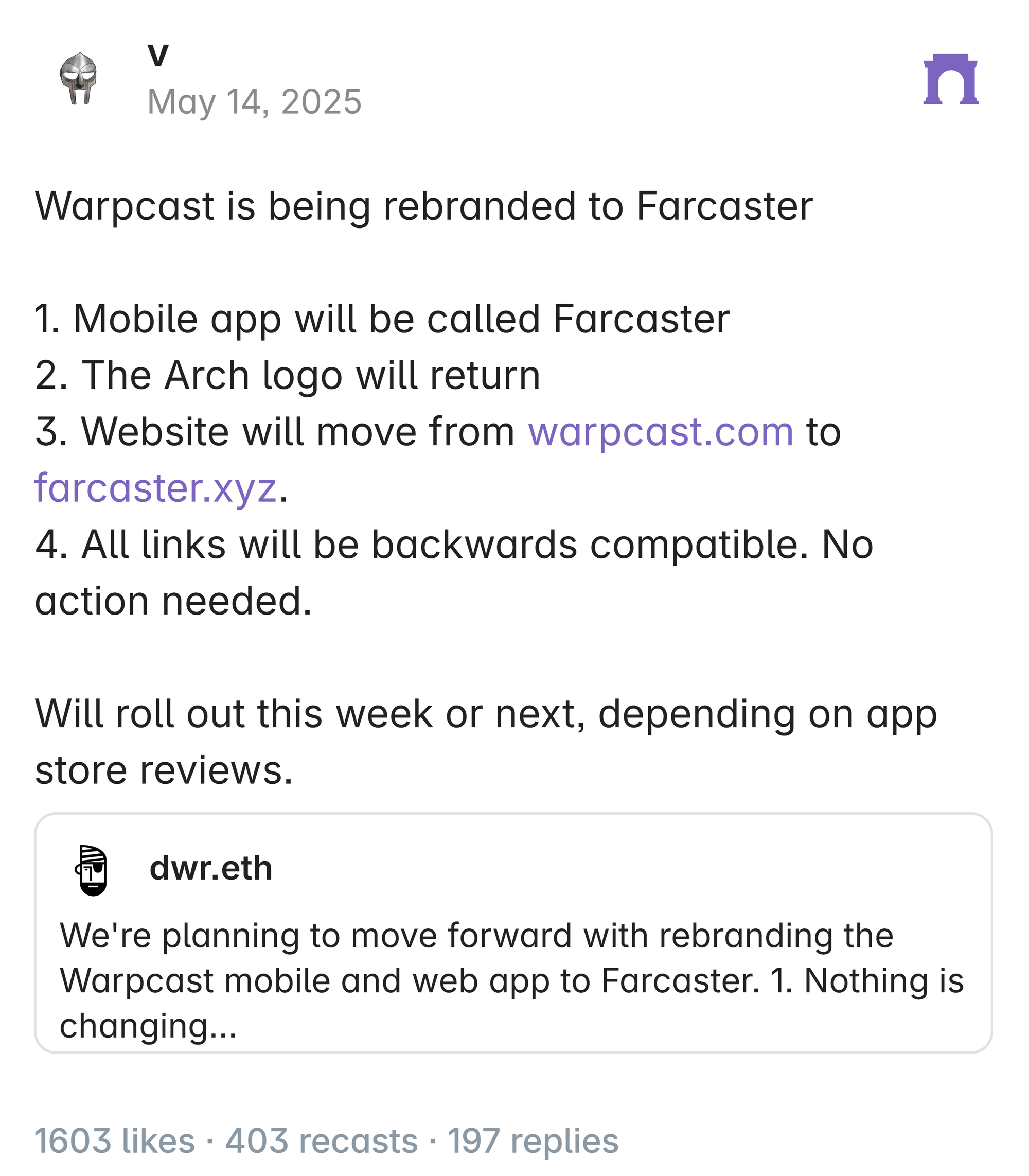 - To nix that problem, the Farcaster team has decided to simplify by rebranding both the Warpcast mobile and web apps to Farcaster.