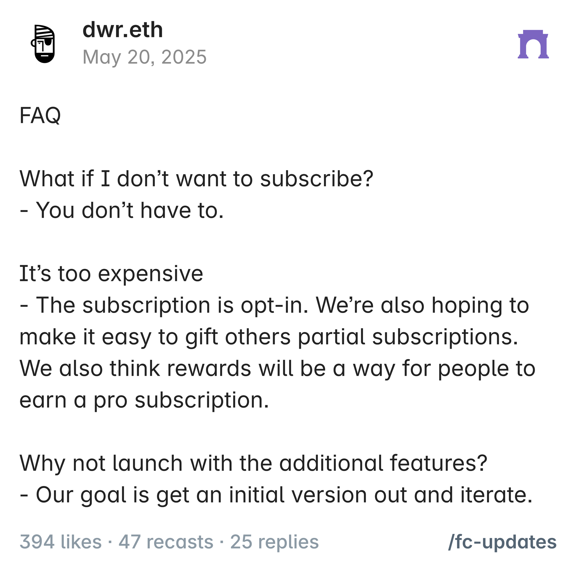 - Notably, all of the earnings from this onchain subs system will be allocated flywheel-style to Farcaster's Creator Rewards program, which already distributes $25k USDC weekly across the top posters on Farcaster.