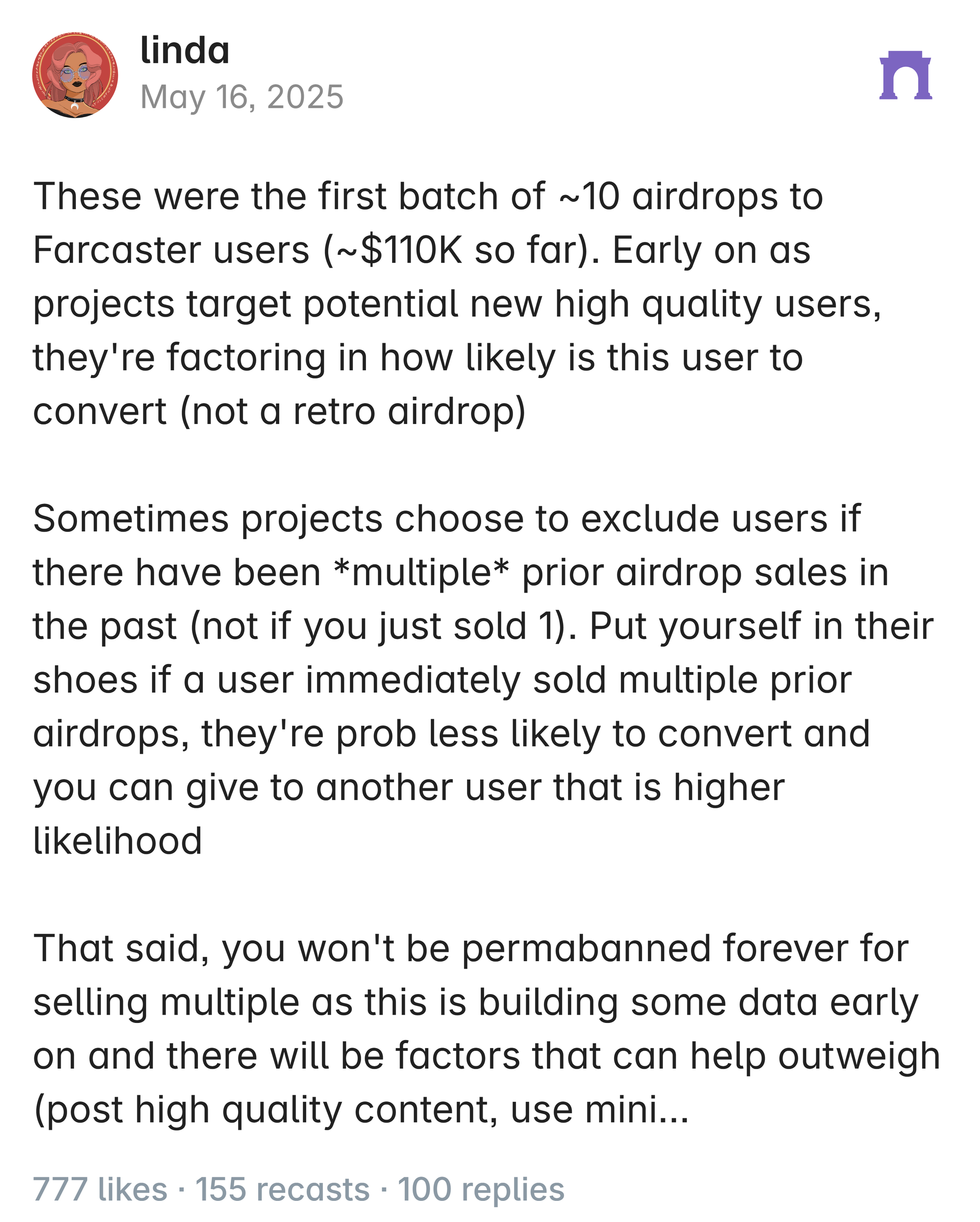 - These first drops have averaged around ~$10 a pop, offering an easy way to keep your Farcaster wallet loaded. But Linda Xie, Farcaster's developer ecosystem lead, has noted that some projects will exclude people who have sold multiple prior airdrops. If you dive in here, consider holding as long as possible to maximize your chances for future distributions.