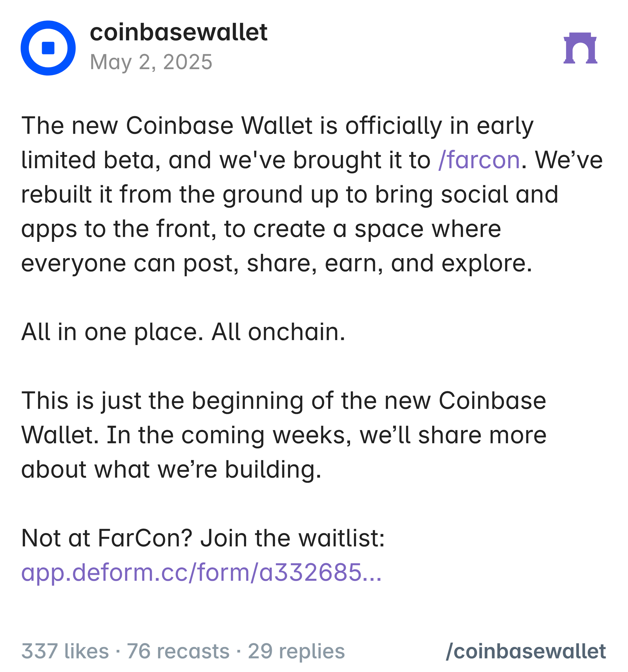 - In other words, soon you'll be able to post and transact on Farcaster directly from within Coinbase Wallet. There will be an in-wallet social feed you can scroll and comment through, plus a search and discovery flow for Farcaster Mini Apps.