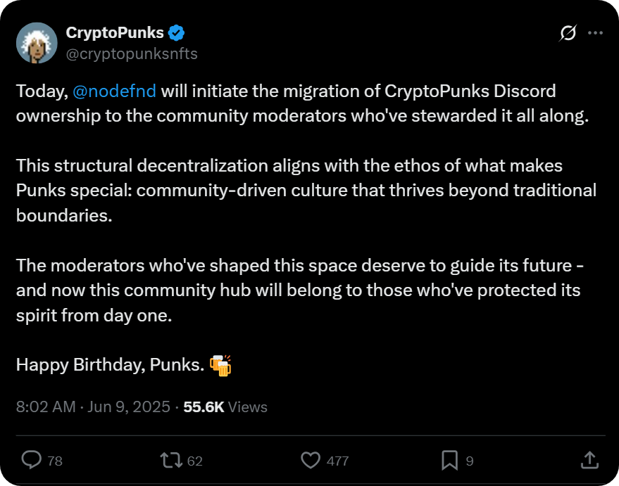 That's because this week, NODE kicked off the ownership transfer of the 21k-member CryptoPunks Discord to the volunteer moderators who’ve nurtured the server since 2017.