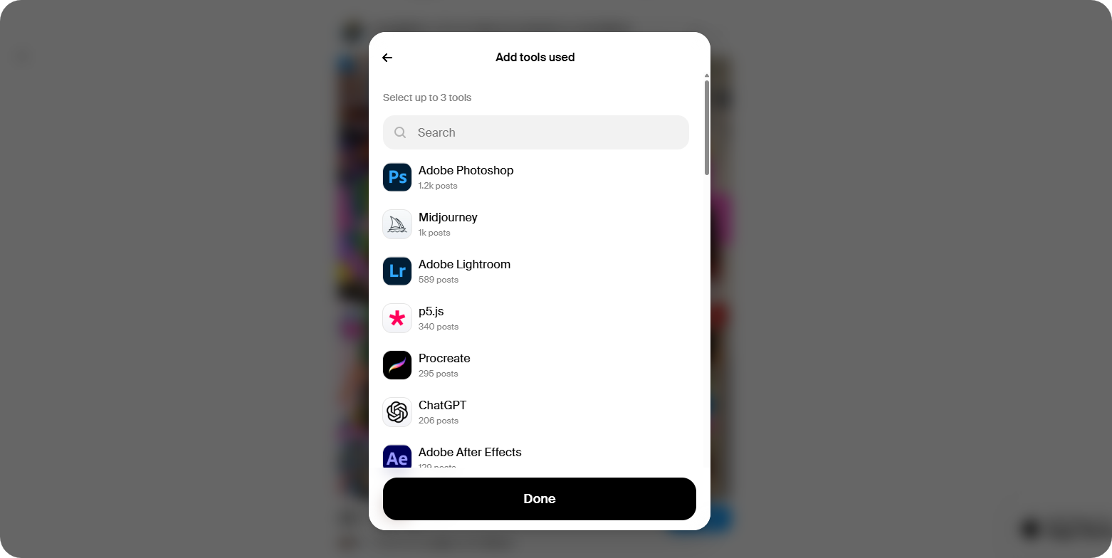 The functionality lets users easily highlight which tools went into making their pieces, like the creative p5.js JavaScript library or AI image generators like ChatGPT and Midjourney.