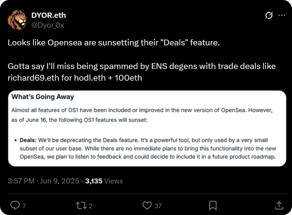 With OpenSea's O2 rebuild now the default marketplace infra, the team announced that the legacy Os1 site will be switched off on June 16th.