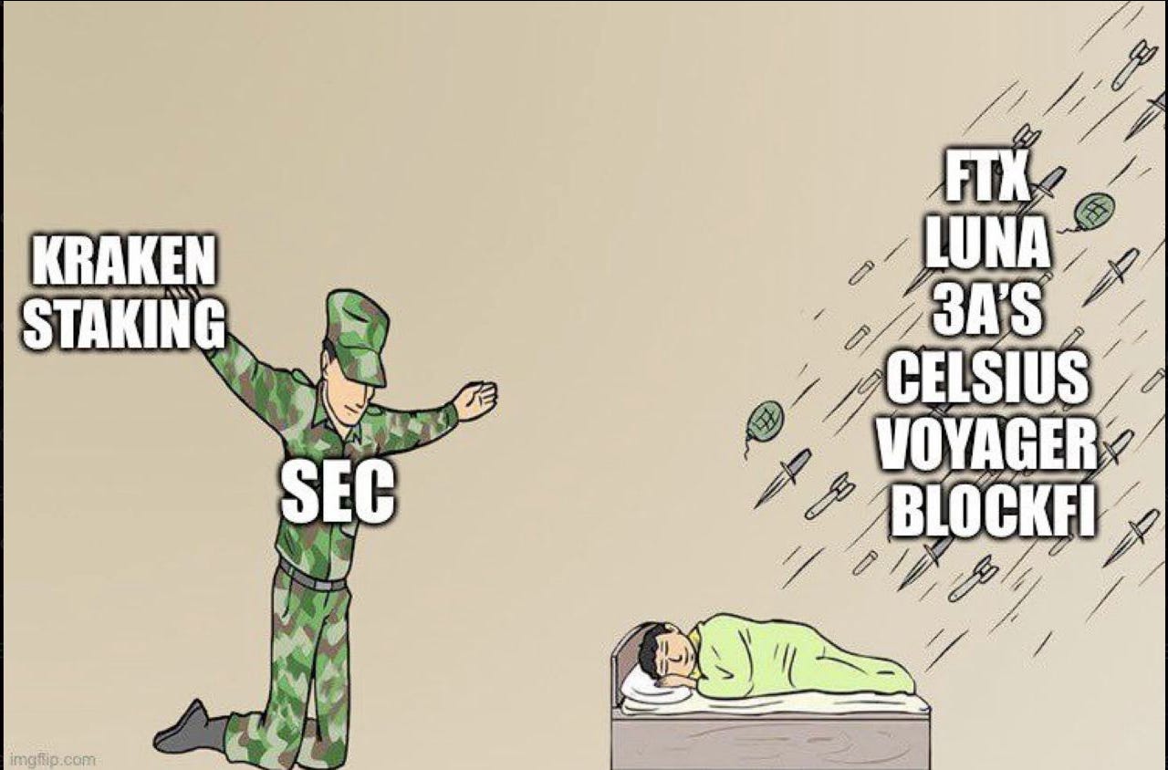 The problem is that even if Kraken purports to offer its staking service as a security product (they donāt), the SEC isnāt showing the green light to anyone.