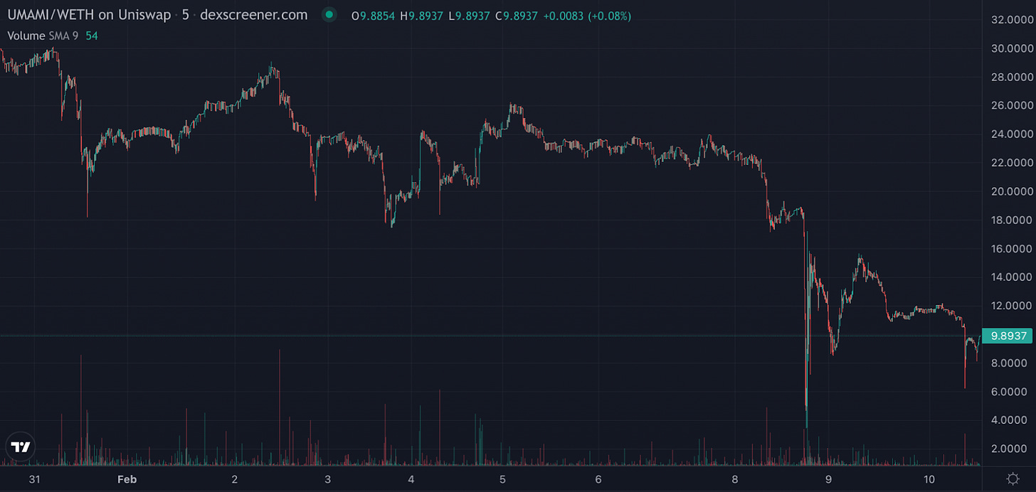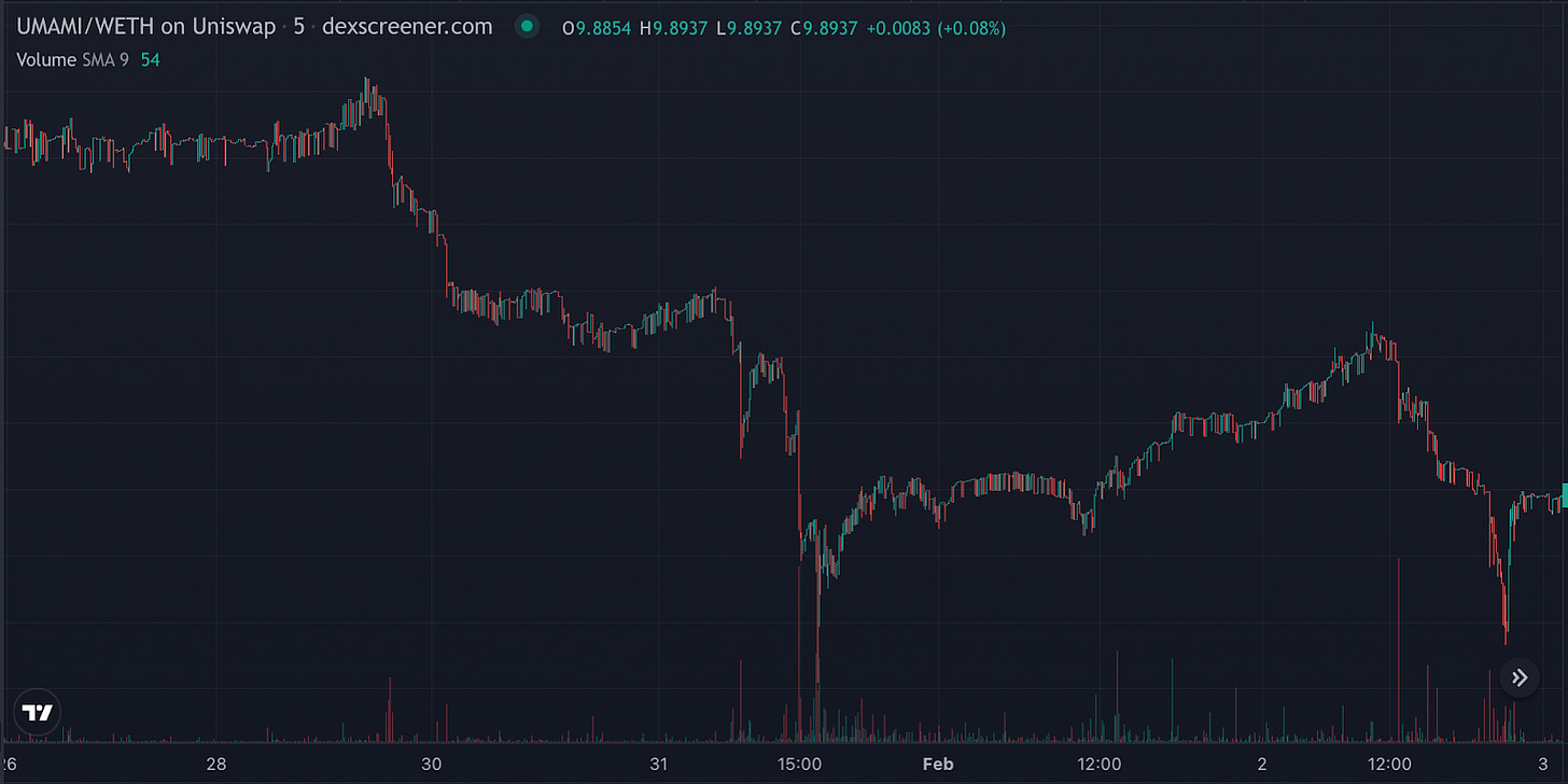 - Umami has been embroiled in controversy over the past few weeks. The drama first began on January 31, when the former lead of the project, Alex OāConnell, announced that the project would stop distributing ETH payouts to UMAMI stakers. Previously, Umami shared a portion of the yield generated by the project's treasury with stakers. The price of UMAMI fell 37.9% in the immediate aftermath of this news.
