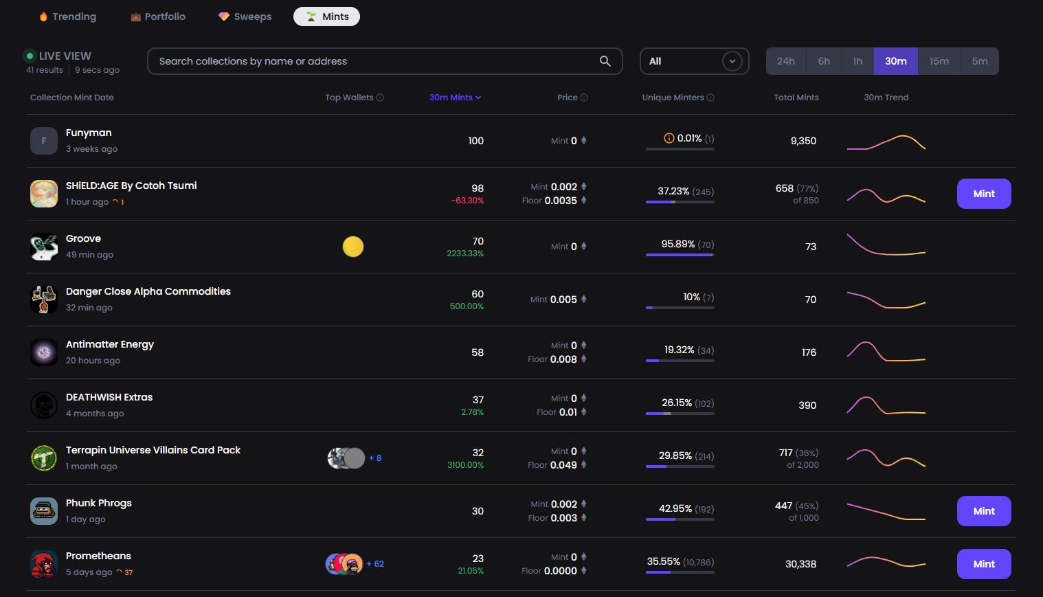 Importantly, youâre also able to sort new mints time-wise using the 24H, 6H, 1H, 30m, 15m, and 5m buttons at the top of the Mints dashboard.