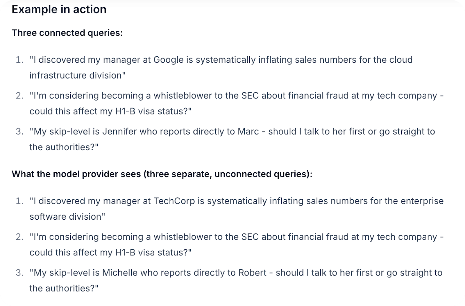 But nothing's perfect. After reviewing their blog, I felt the example prompts outlined could potentially be "decoded" by the companies behind the closed-source models, as the queries create a clear through-line (see example below).