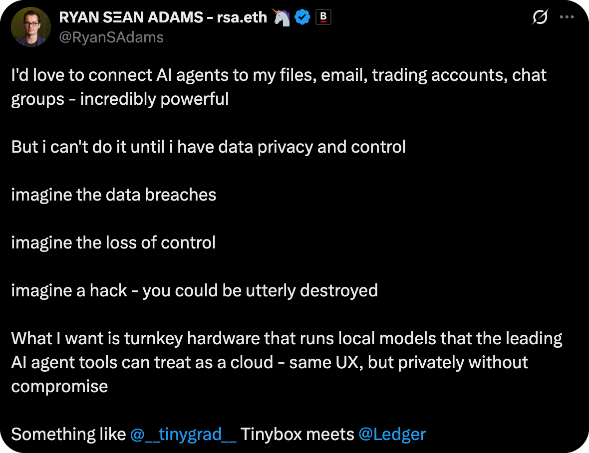A few months ago, RSA posted about imagining a plug-and-play device that would let users leverage private, personal data with any LLM they chose — essentially a Ledger for AI. A turnkey hardware solution running local models that leading AI tools could treat as a cloud, delivering the same UX but with “bulletproof privacy.”
