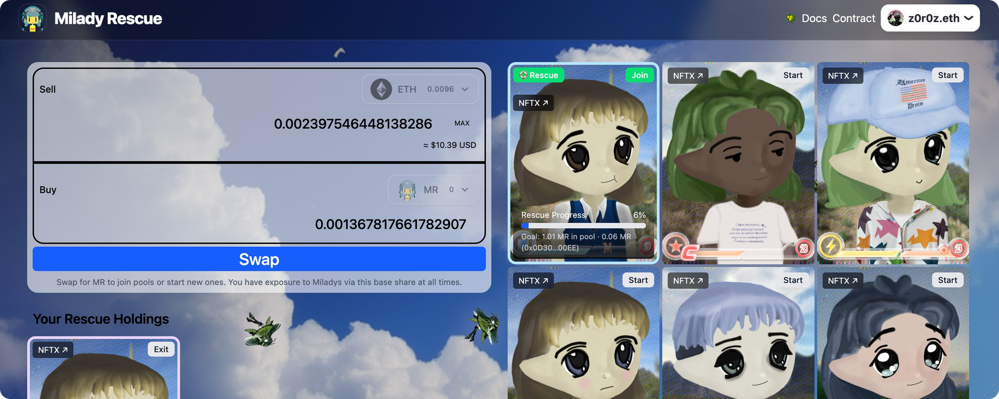 - 🟩 Milady Rescue launched via zAMM by ross. It's a game with DAO + DeFi + NFT legos where players "save" vaulted Miladys from NFTX.